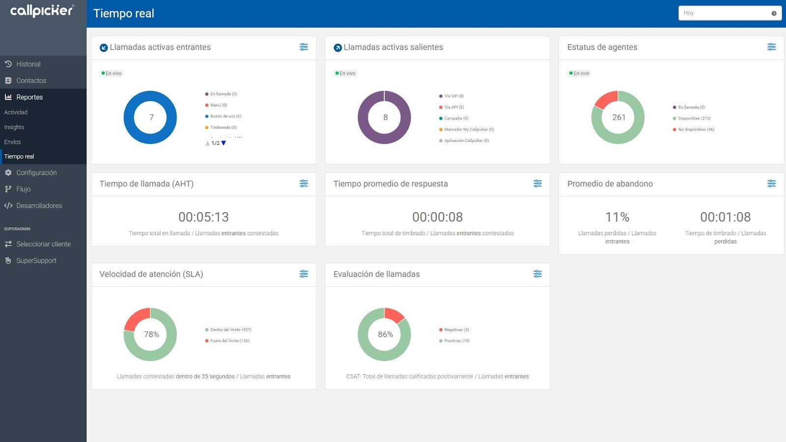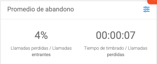 - Porcentaje de abandono, calculado como la proporción de llamadas abandonadas respecto al total de llamadas entrantes (total de llamadas abandonadas / total de llamadas entrantes).